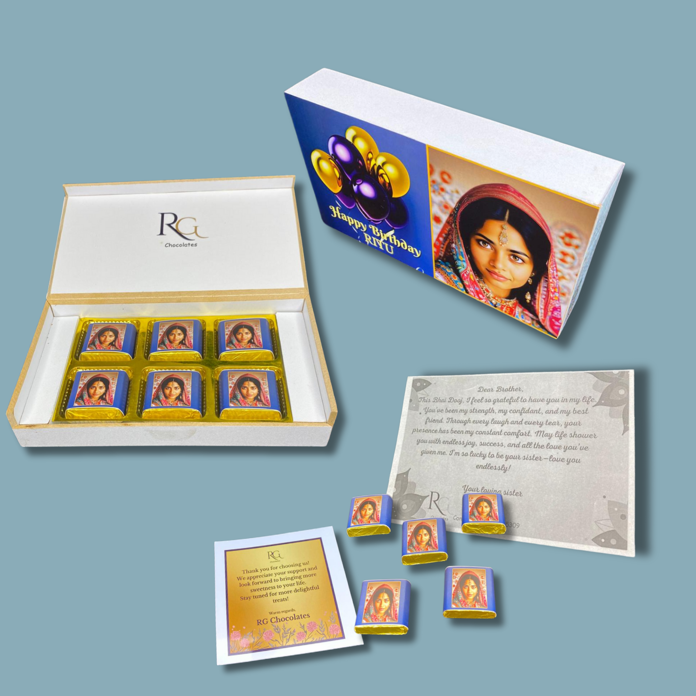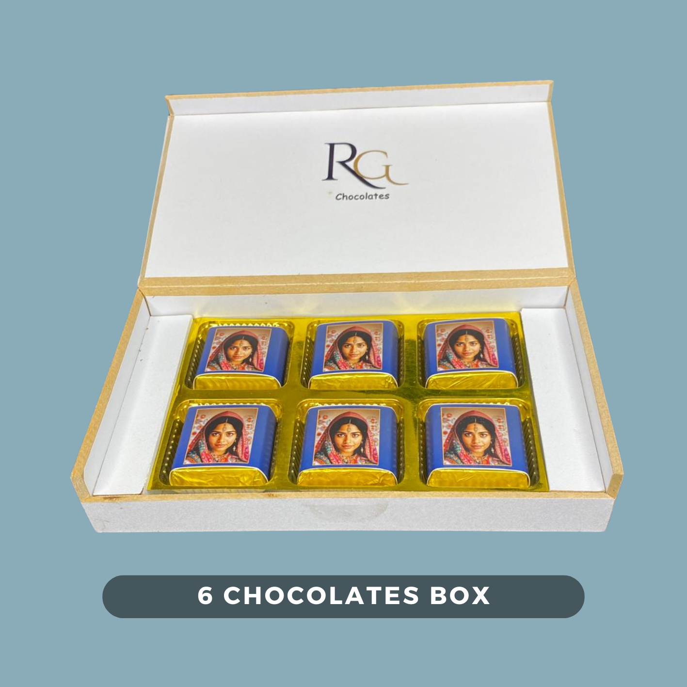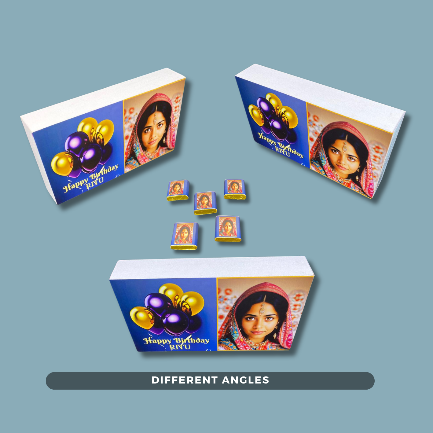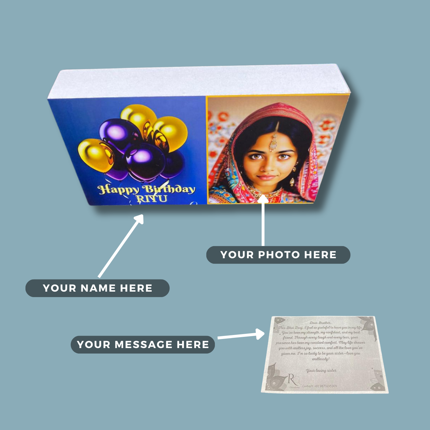 - Kindly share the recipient's name for personalization on the box. Upload the photo you wish to have printed on both the box and chocolates.